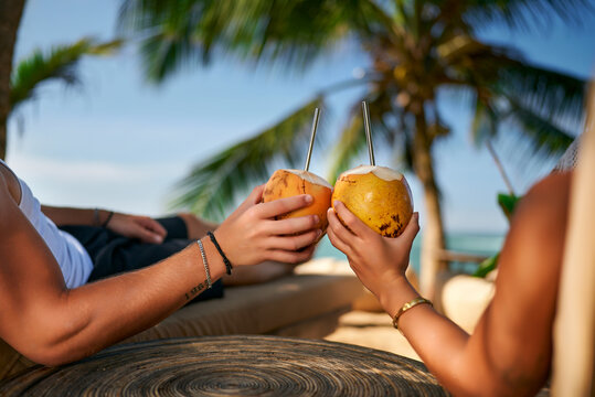 Couple enjoys fresh coconut water on tropical beach, seated under palm tree. Man and woman toast coconuts, sipping drinks, ocean view. Romantic getaway, leisure moment, chill vacation vibe.