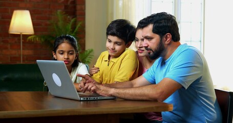 Family using laptop together at home sitting at dining table in modern living room, Indian parents children scrolling, surfing, planning vacation or shopping online while enjoying quality time