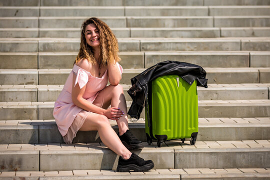 Back view of woman in hat with suitcase and pillow looking at schedule in airport