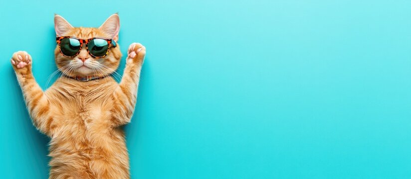 Cool ginger cat wearing sunglasses on blue background.