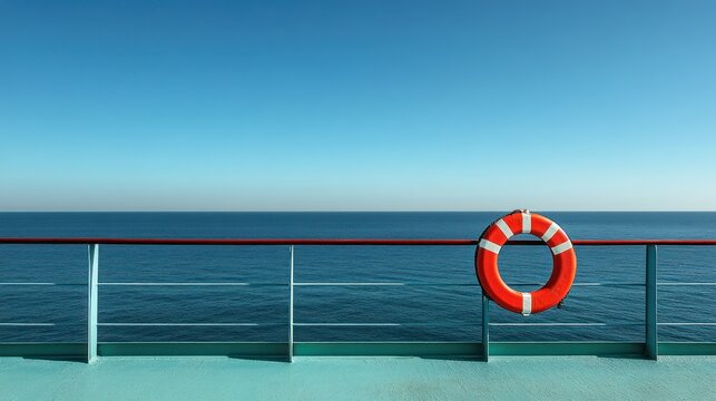 Ocean cruise ship railing with life preserver, clear sky, calm sea