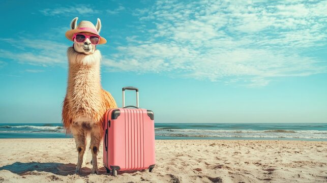 A llama on the beach with a pink suitcase.