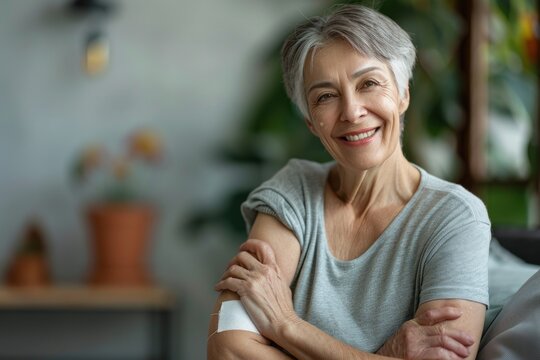 Smiling healthy mature older senior happy woman showing bandage on arm after getting vaccination