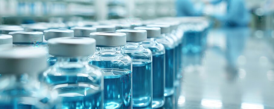 Close-up of rows of medical vials filled with blue liquid, representing laboratory, pharmaceutical, or vaccine research environment.