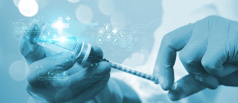 health insurance concept. Doctor or scientist with stethoscope in hand with syringe vaccine showing health insurance related icons on virtual screen.