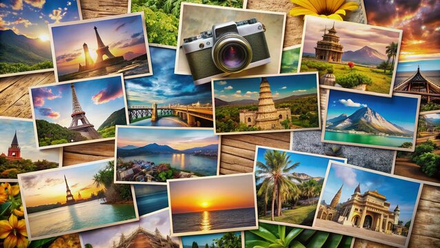Vibrant collage of snapshots showcasing exotic landscapes, iconic landmarks, and rustic scenery, surrounded by Polaroid frames and camera lenses, nostalgic travel memories.