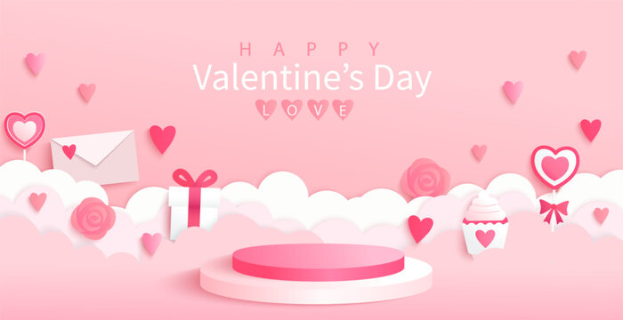 Happy Valentine's day promo banner. Round podium for ad, holiday scene for product display presentation.Backdrop for cosmetic product display.Template for retail,shops,web,social media.Vector