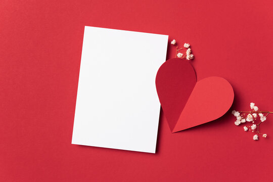Blank Valentines Day greeting card mockup on red background