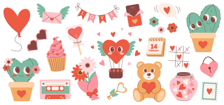Set of cute valentines day stickers. Hearts, cupcake, flowers, cactus, bear, sweets and other romantic elements. Vector illustrations for greeting cards, banners, posters, planners