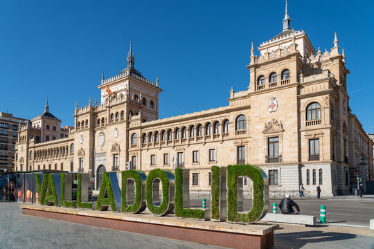 Valladolid in the Spain emblem for print and web. Design features geometric style, vector illustration with bold typography in modern font. Graphic slogan lettering isolated on white background.