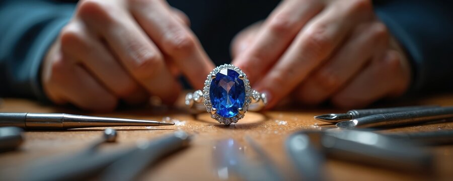 Jeweler hands meticulously set large sparkling blue sapphire into diamond halo ring. Artisan crafts luxury precious jewelry with hand tools in busy workshop studio. Highlights intricate design, fine