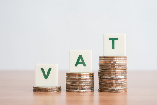 Word VAT on step stacked coins as graph up over white background. Vat concept. Value Added Tax is an indirect tax imposed on the value added of each stage of production and distribution.