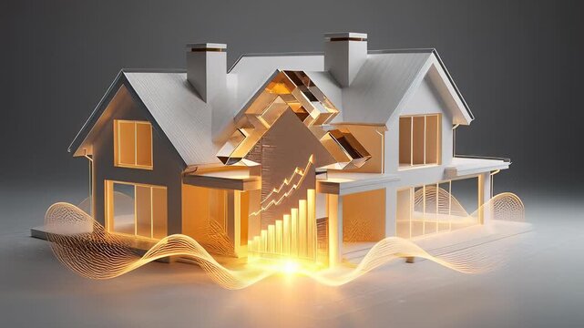 Mortgage and Real Estate Investment concept featuring a futuristic 3D house model with a glowing upward arrow and financial graph, symbolizing property value appreciation and market growth.