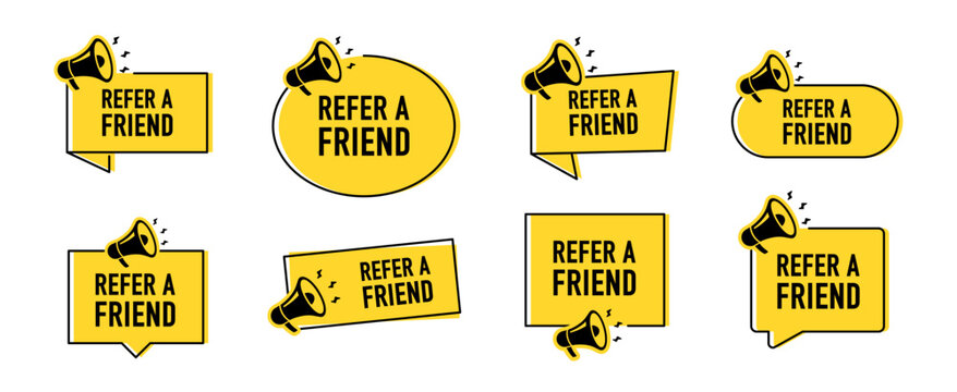 Megaphone with refer a friend speech bubble. Loudspeaker. Banner for business, marketing and advertising. Vector illustration.