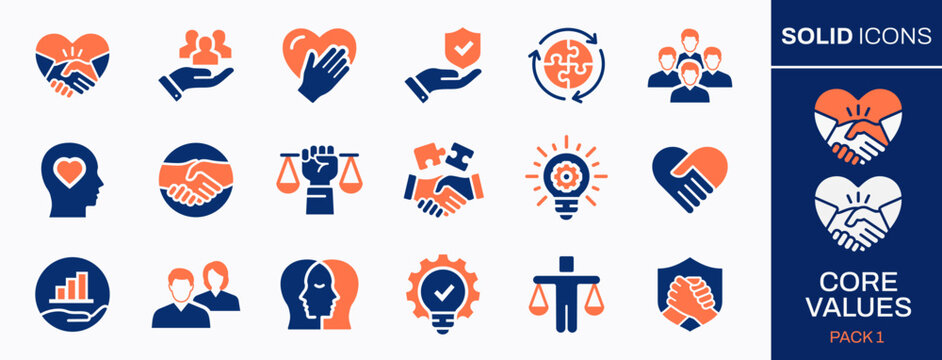 Core values icon set. Collection of business, social responsibility, mission, integrity and more. Vector illustration. Easily changes to any color.