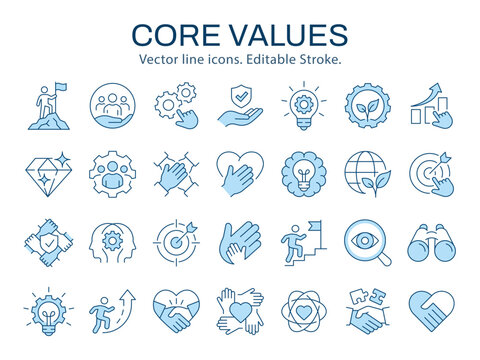 Core value icons such as trust, handshake, company, mission and more. illustration isolated on white. Editable stroke.