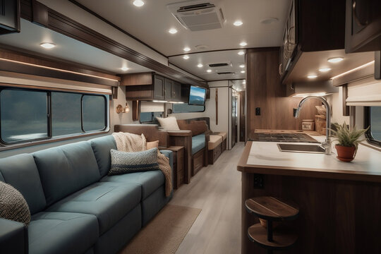 Interior of Modern Recreational Vehicle with Kitchen and Seating Area