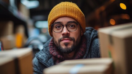 Delivery driver navigating a busy street lined with holiday lights and packages during the festive season