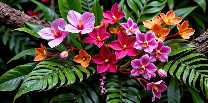 Lush tropical floral arrangement featuring Monstera, ferns, Vanda orchids, and vibrant foliage cascading from a natural tree branch, vibrant, jungle