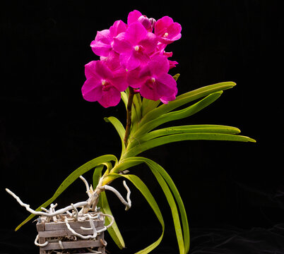Pink vanda orchid against a black background