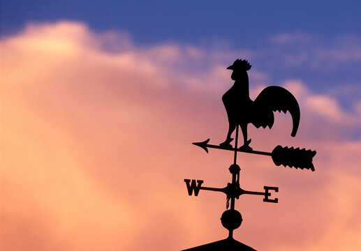 Silhouette of weather vane for wind direction, decorative metallic rooster at colorful dawn. No AI tools were used.  Creative collage, my own photos and traditional digital enhancement tools were used