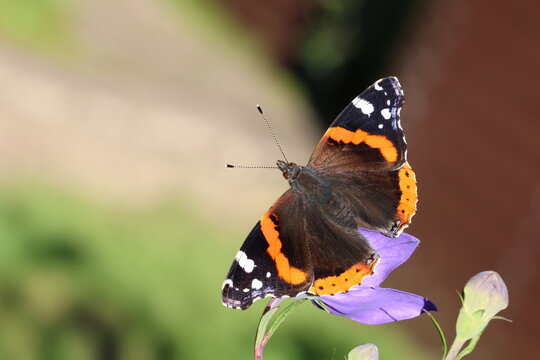 Red admiral (Vanessa atalanta) perching on blooming flowers