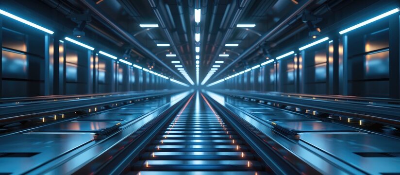 Futuristic sci fi interior corridor with vanishing perspective leading into a long illuminated blue hallway with geometric patterns and clean minimalist design