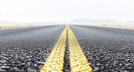 Empty asphalt road with double yellow lines vanishing into hazy horizon.