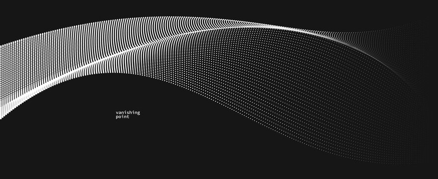 A rhythmic black grid undulates across a white backdrop, distorting near a central vanishing point to evoke a sense of depth, pattern, and dynamic movement in the monochrome composition