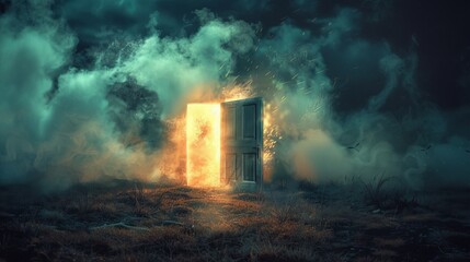 An open door emitting light, symbolizing the gate between heaven and hell, with smoke swirling and souls in pain, set in a dark, misty field at night
