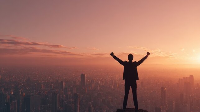 A person stands triumphantly on a high vantage point, arms raised in celebration. The vibrant sunset casts colorful hues over the sprawling city below, creating a moment of joy and accomplishment.