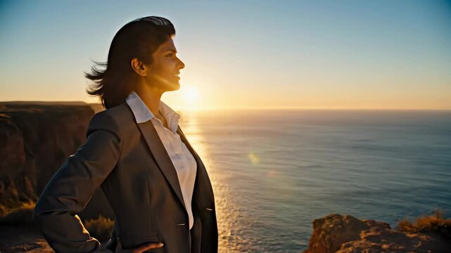 Professional woman looks out at ocean sunset from a high vantage point