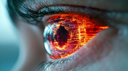 A conceptual vantage from slightly behind, showing the reflection of code or circuitry in the iris, signifying an advanced tech synergy,