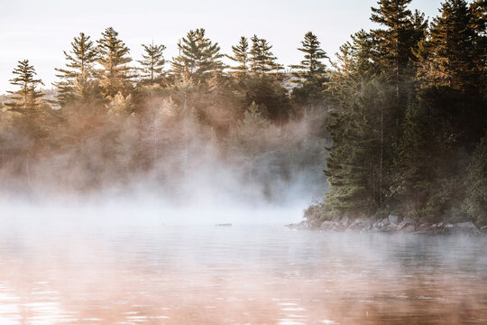 Early morning mist rises off calm waters of Bald Mountain Pond, Maine