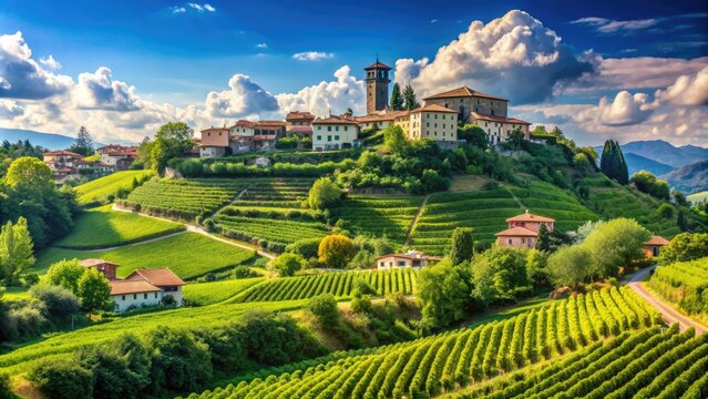 Rolling hills, lush vineyards, and medieval villages nestled in the picturesque Italian countryside of the Province of Varese, Lombardy, under a bright blue summer sky.
