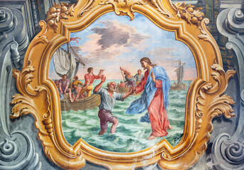 Varallo - The fresco Peter, walking on water toward Jesus in the church Basilica del Sacro Monte by Francesco Leva (1714).