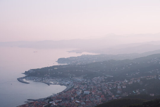View from above of the Ligurian coast with the cities of Varazze and Savona, Liguria, Italy. Ligurian sea in summer time during sunset. Landscape photography