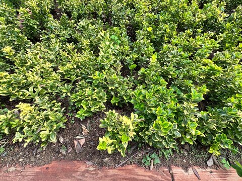 Golden Euonymus (Euonymus japonicus ‘Aureomarginatus’) with bright yellow-edged variegated foliage growing in a garden bed, showcasing its vibrant ornamental color and dense shrub structure.