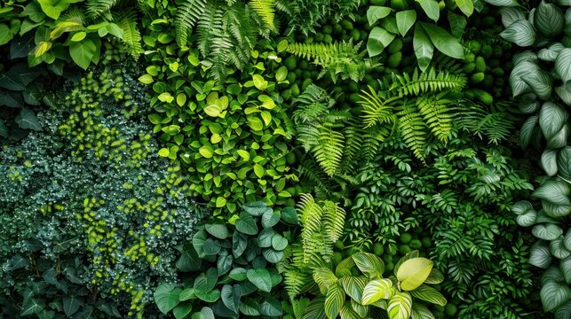 Green wall with various plants and leaves, Green plants background arranged vertically