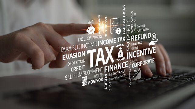 A professional setting displaying a finger pointing at various tax-related terms over a laptop keyboard. This image represents the finance and accounting industry vividly. Tessel