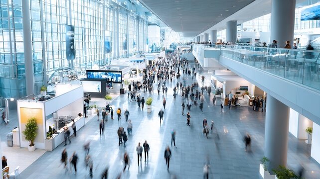 Visitors and exhibitors moving through a busy convention center with motion blur, showcasing the energy and activity a large trade show