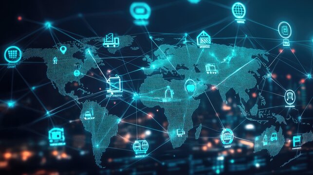 Digital concept of global trade, with icons representing various industries connected by trade routes on a world map