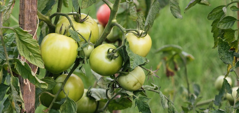 Growing of green tomatoes in the garden. Tied plant. Stages of vegetable ripening. Small harvest due to drought and poor soil. Ecological problem and hunger concept. Copy space. Close-up