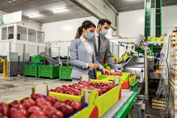 Fruit and apple inspection by management of the company. Man and woman wear elegant suits and protective face masks while standing in the process of making apples. Fruit quality check in the factory