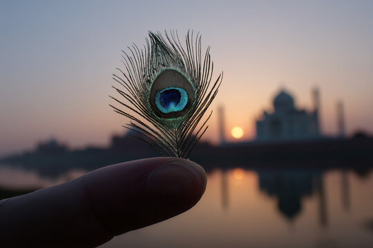 "A peacock feather-mimic butterfly on a finger, Taj Mahal silhouette at sunrise