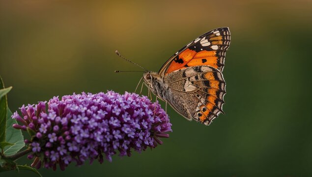 Orange and black butterfly feeding on purple Buddleja davidii blossoms during sunset