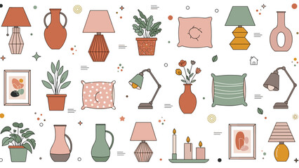 Collection of cozy home decor elements like lamps, vases, pillows, and potted plant illustrations