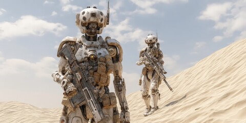 Dos robots soldados patrullan un vasto desierto de arena blanca bajo un cielo azul intenso.
