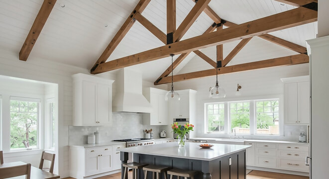 Elegant and spacious kitchen showcasing a vaulted ceiling with exposed wood beam trusses, white cabinets, and a large central island.