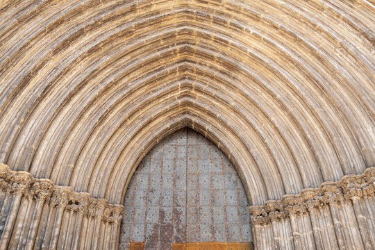 Gothic vaulted ceiling with stone ribs forming symmetrical arches, medieval architecture detail, Valderrobres, Aragon, Spain